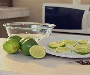 Para tirar o mau cheiro do micro-ondas, por exemplo depois de preparar pipocas, coloque em um recipiente meio litro de água com algumas rodelas de limão ou lima. Coloque o recipiente dentro do micro-ondas por cerca de 5 minutos na potência máxima e verá como o mau cheiro desaparecerá.