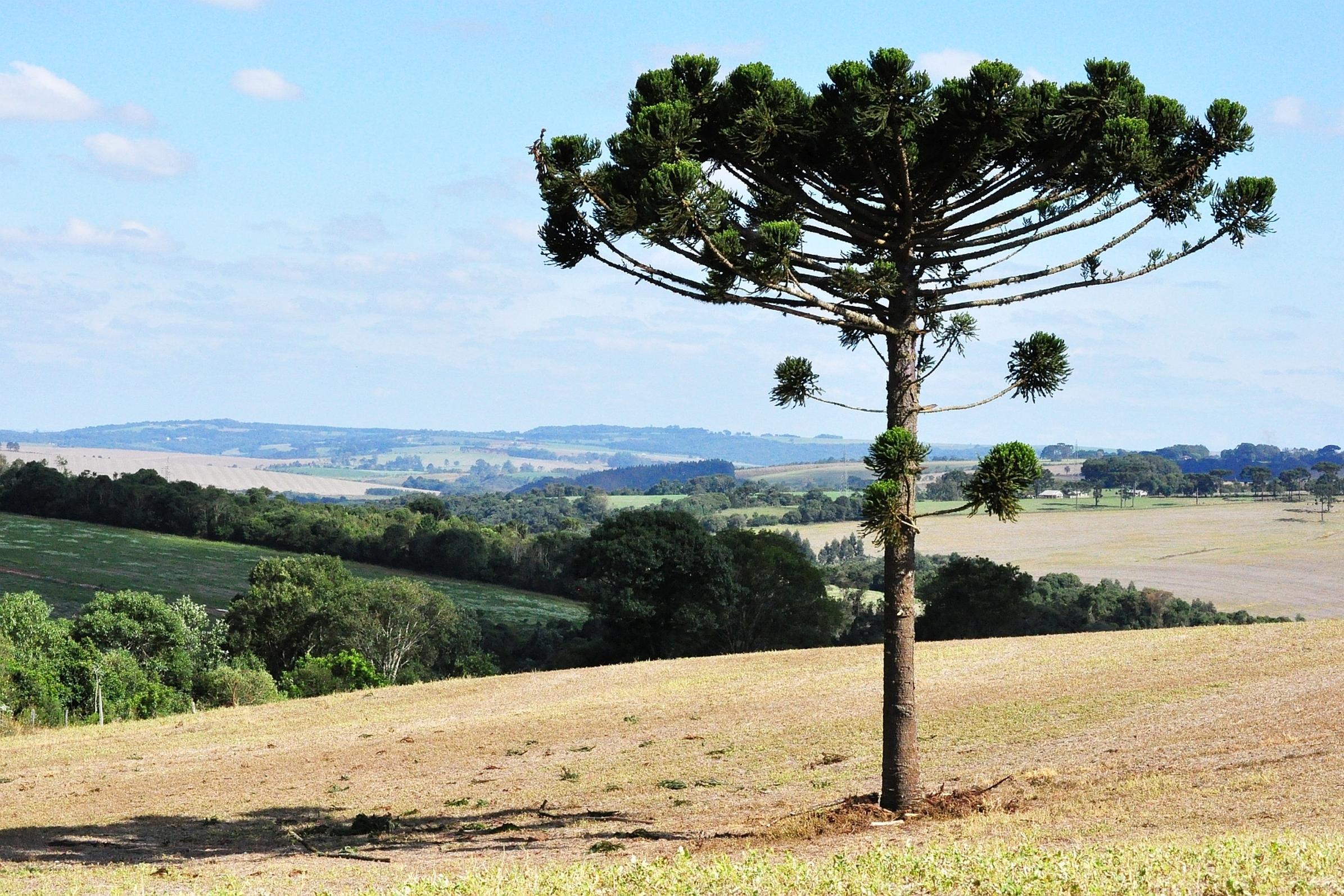 Também chamado de pinheiro do Paraná em razão de sua distribuição na natureza, a araucária é uma árvore que pode atingir até 50 metros de altura e que se encontra na lista de espécies mais antigas do Brasil. Apesar de surgir naturalmente em todo o planalto sul brasileiro, a araucária acabou por entrar em extinção em razão da exploração da espécie, quadro que tem sido revertido em razão de políticas de conservação.[5]
