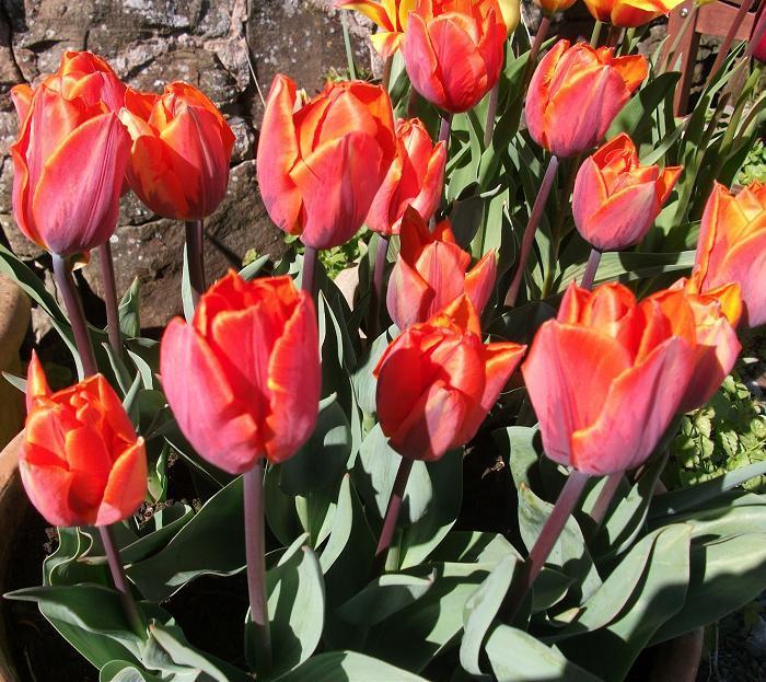 Tulipas caracterizadas por sua cor vermelho intenso com uma margem amarela.