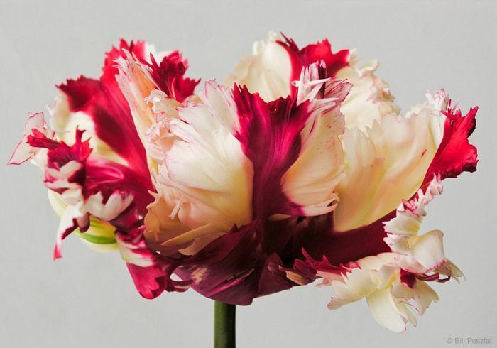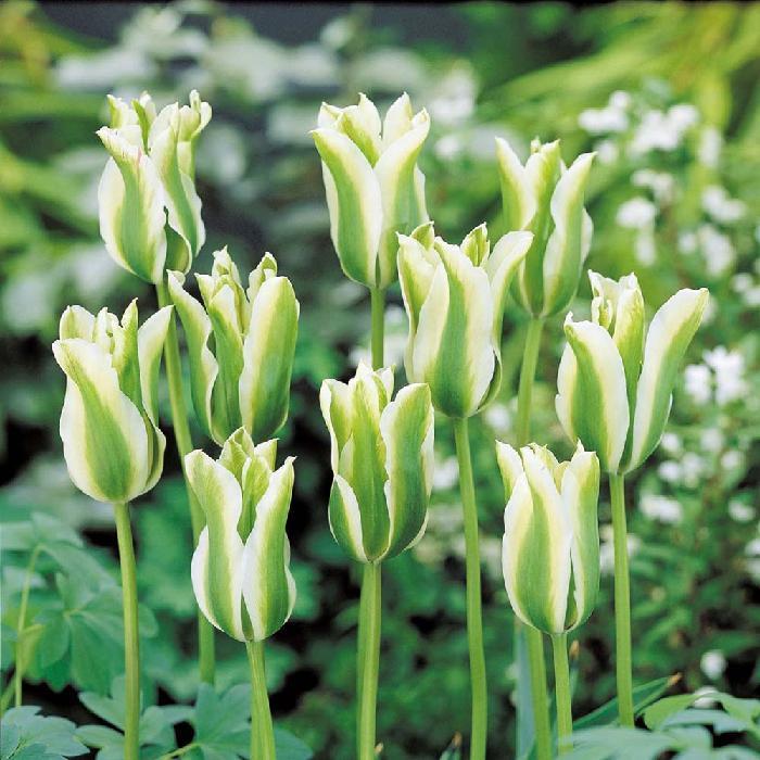 Esta variedade de tulipa tem pétalas em forma de pluma de cor branca com listras verdes, chamam muito a atenção por não serem das mais comuns.