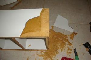 No que se refere à umidade, nem um nem outro são muito resistentes, mas na dúvida escolha MDP, que absorve menos e não dilata, ao contrário do que acontece com o MDF. Um móvel em MDF está absorver tanta umidade que acabará por ficar deformado e destruído, como na imagem.